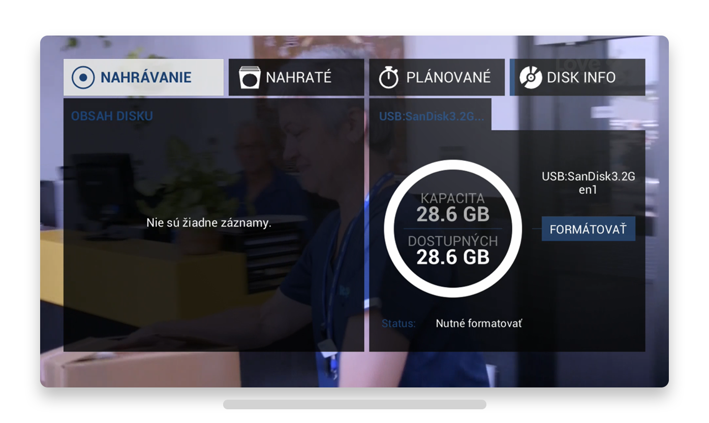 Poznámka: Pred nahrávaním je nutné disk naformátovať. V časti MENU > NAHRÁVANIE > DISK INFO stlačte tlačidlo FORMÁTOVAŤ a potvrďte OK.