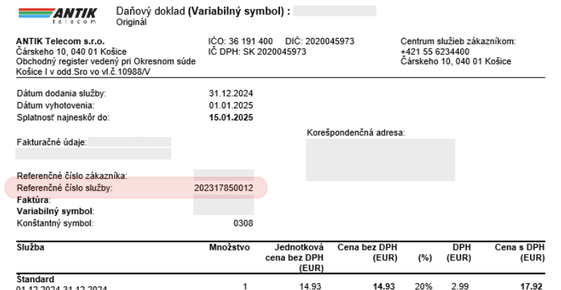 Ako Identifikátor služby prístupu k internetu sa zadáva "Referenčné číslo služby" ktoré ma zákaznik uvedené na svojej mesačnej faktúr